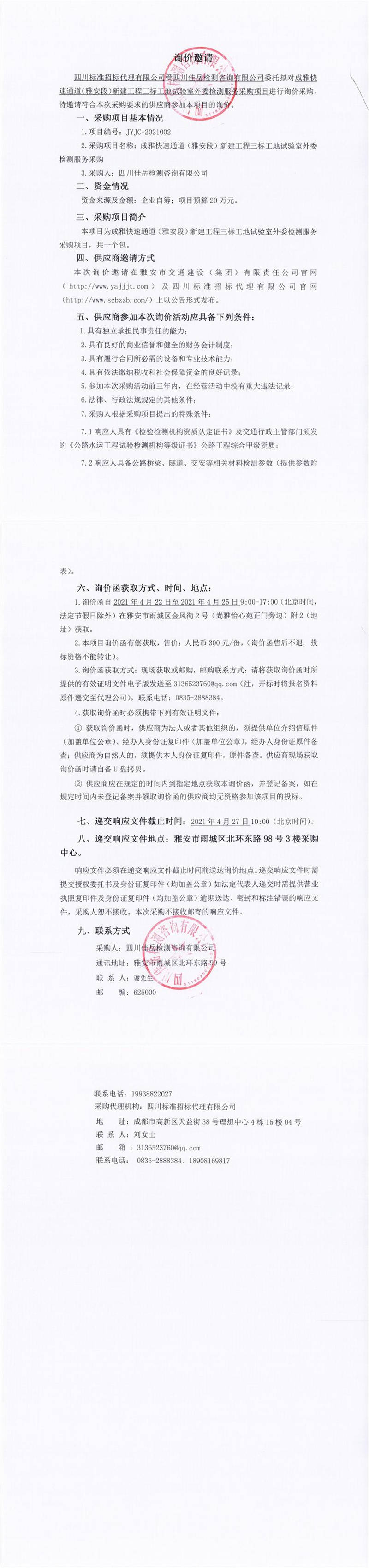 四川佳岳檢測咨詢有限公司成雅快速通道(雅安段)新建工程三標(biāo)工地試驗(yàn)室外委檢測服務(wù)采購詢價(jià)公告