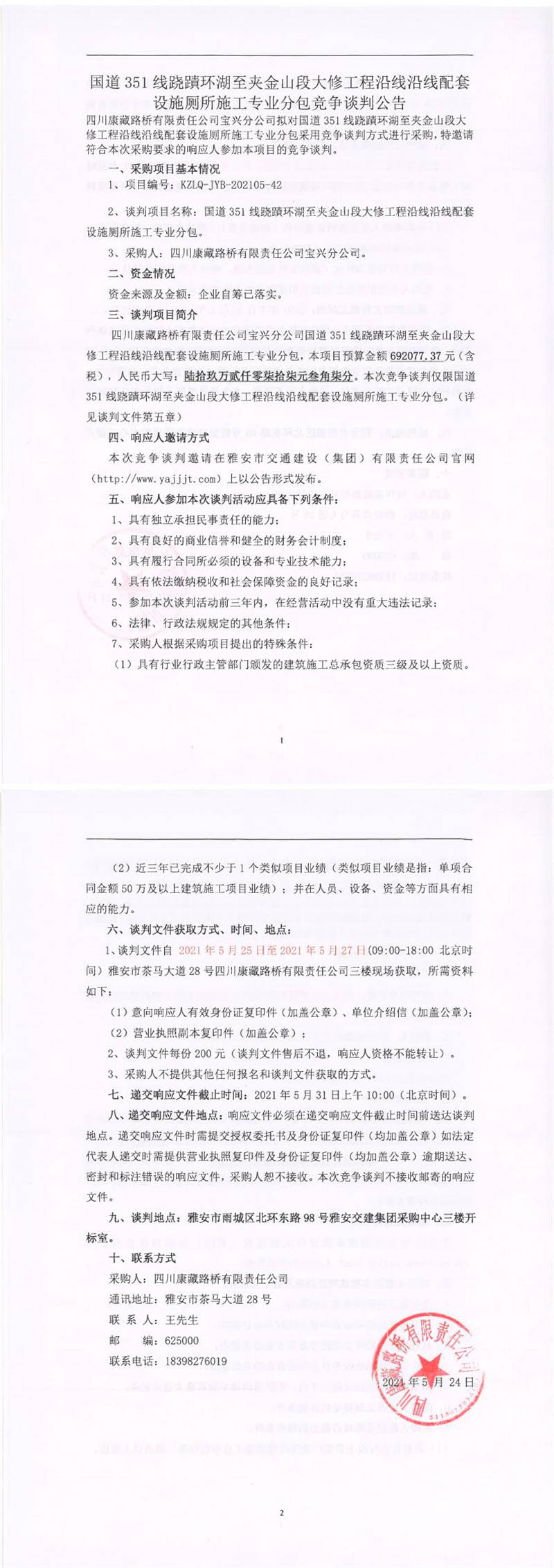 四川康藏路橋有限責(zé)任公司寶興分公司國(guó)道351線蹺磧環(huán)湖至夾金山段大修工程沿線沿線配套設(shè)施廁所施工專業(yè)分包競(jìng)爭(zhēng)談判公告