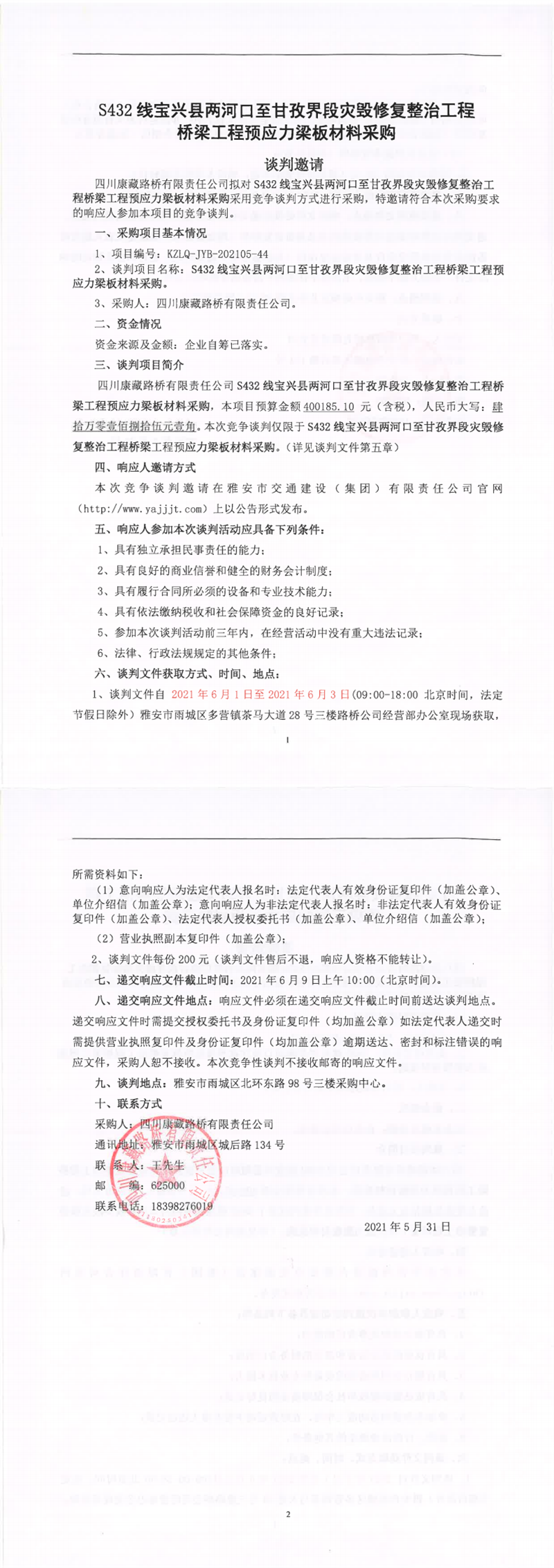 四川康藏路橋有限責任公司G108線石棉水毀整治項目K2621+989.5爛碉房中橋項目材料采購競爭談判公告