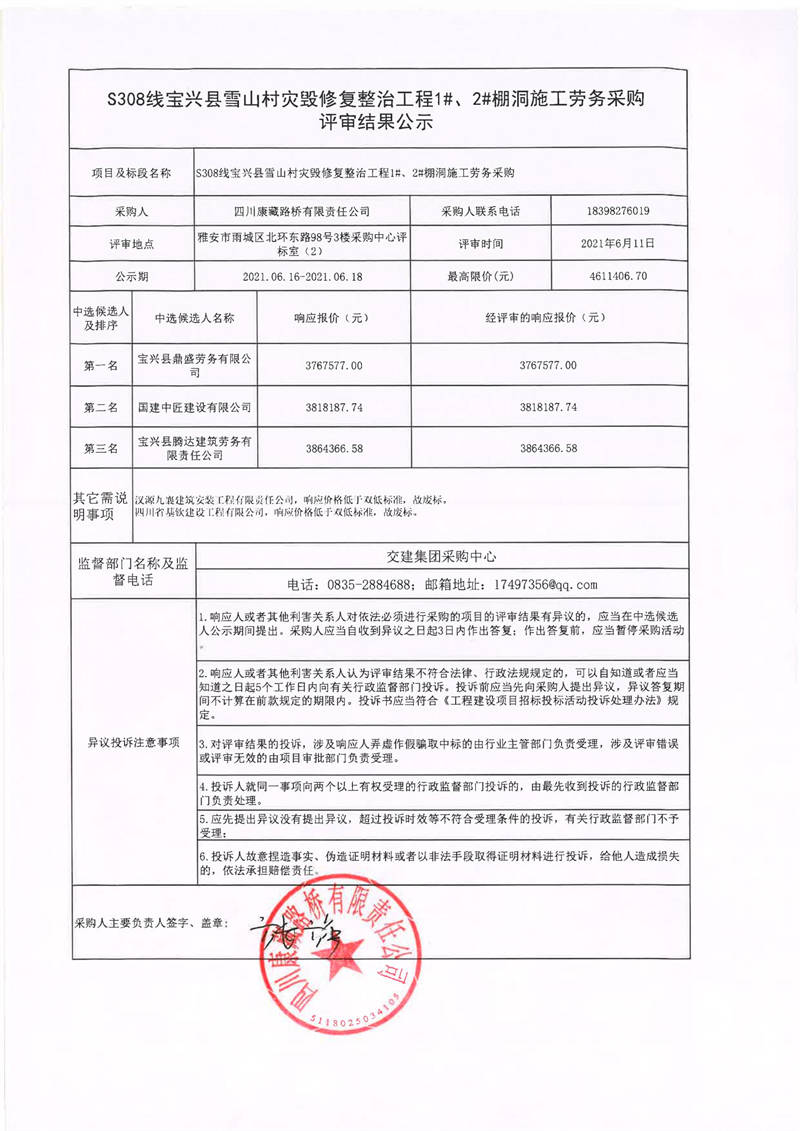 四川康藏路橋有限責(zé)任公司S308線寶興縣雪山村災(zāi)毀修復(fù)整治工程1#、2#棚洞施工勞務(wù)采購評審結(jié)果公示