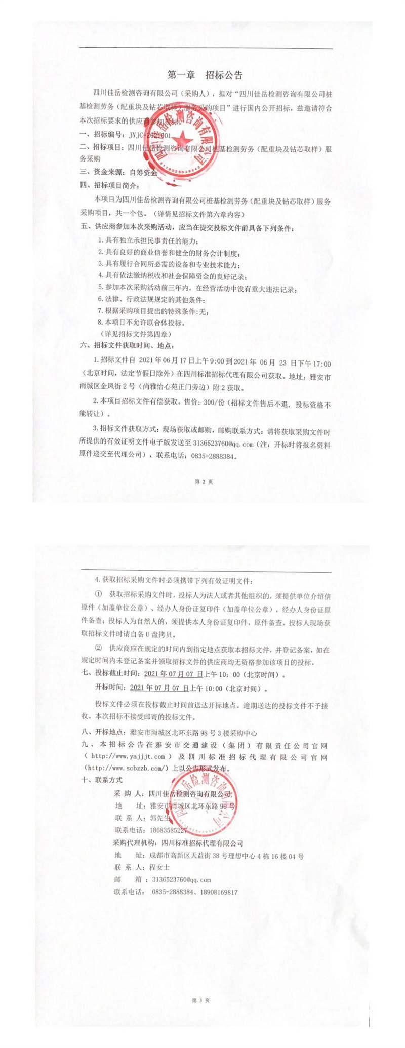 四川佳岳檢測(cè)咨詢有限公司樁基檢測(cè)勞務(wù)(配重塊及鉆芯取樣)服務(wù)采購招標(biāo)公告