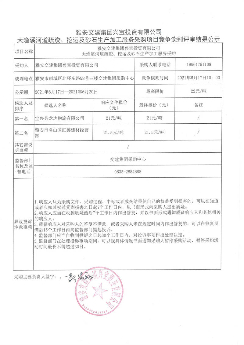 雅安交建集團興寶投資有限公司大漁溪河道疏浚、挖運及砂石生產(chǎn)加工服務采購項目競爭談判評審結(jié)果公示