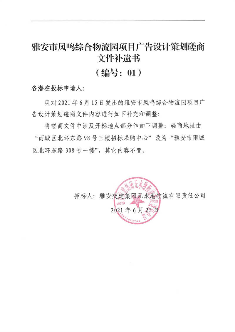 雅安交建集團無水港物流有限責任公司雅安市鳳鳴綜合物流園項目廣告設計策劃磋商文件補遺書