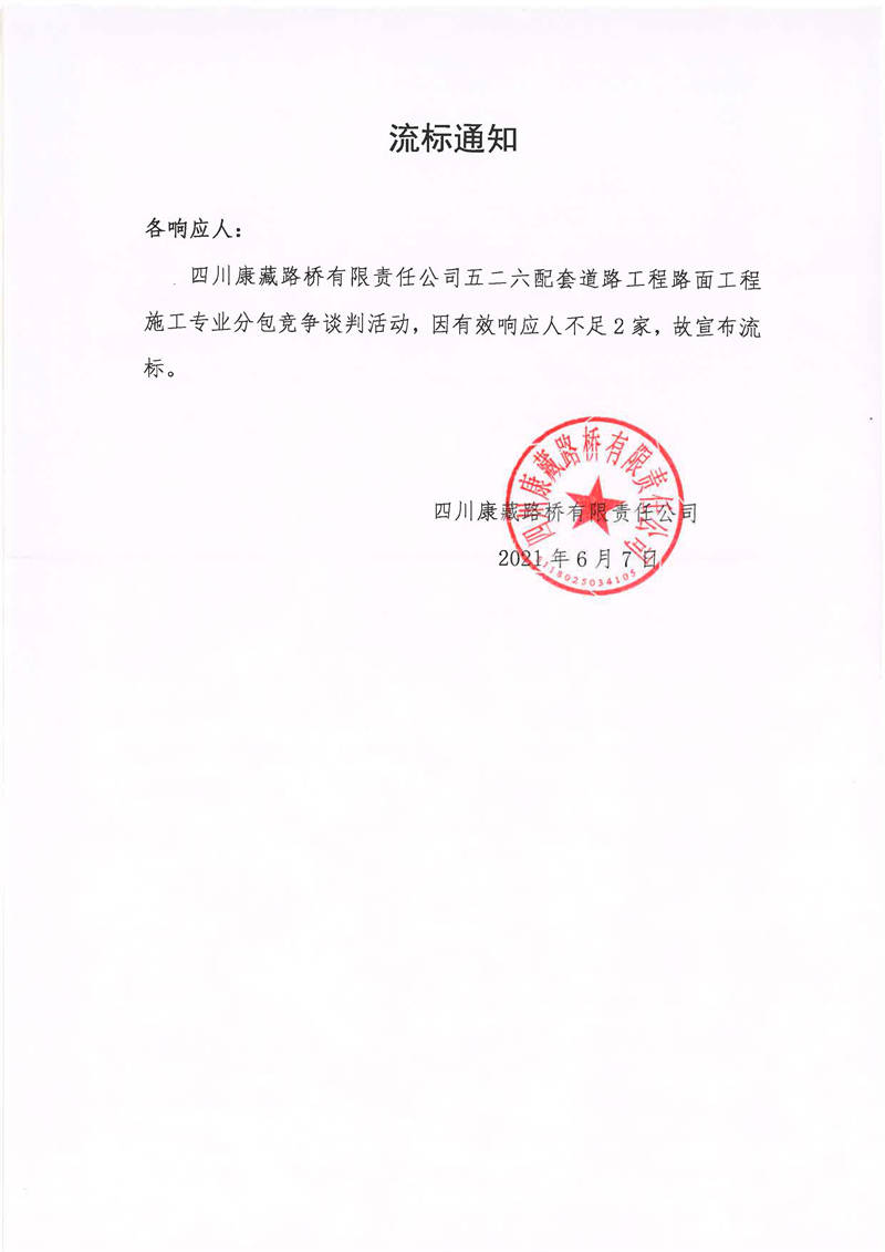四川康藏路橋有限責任公司五二六配套道路工程路面工程施工專業(yè)分包競爭談判流標通知