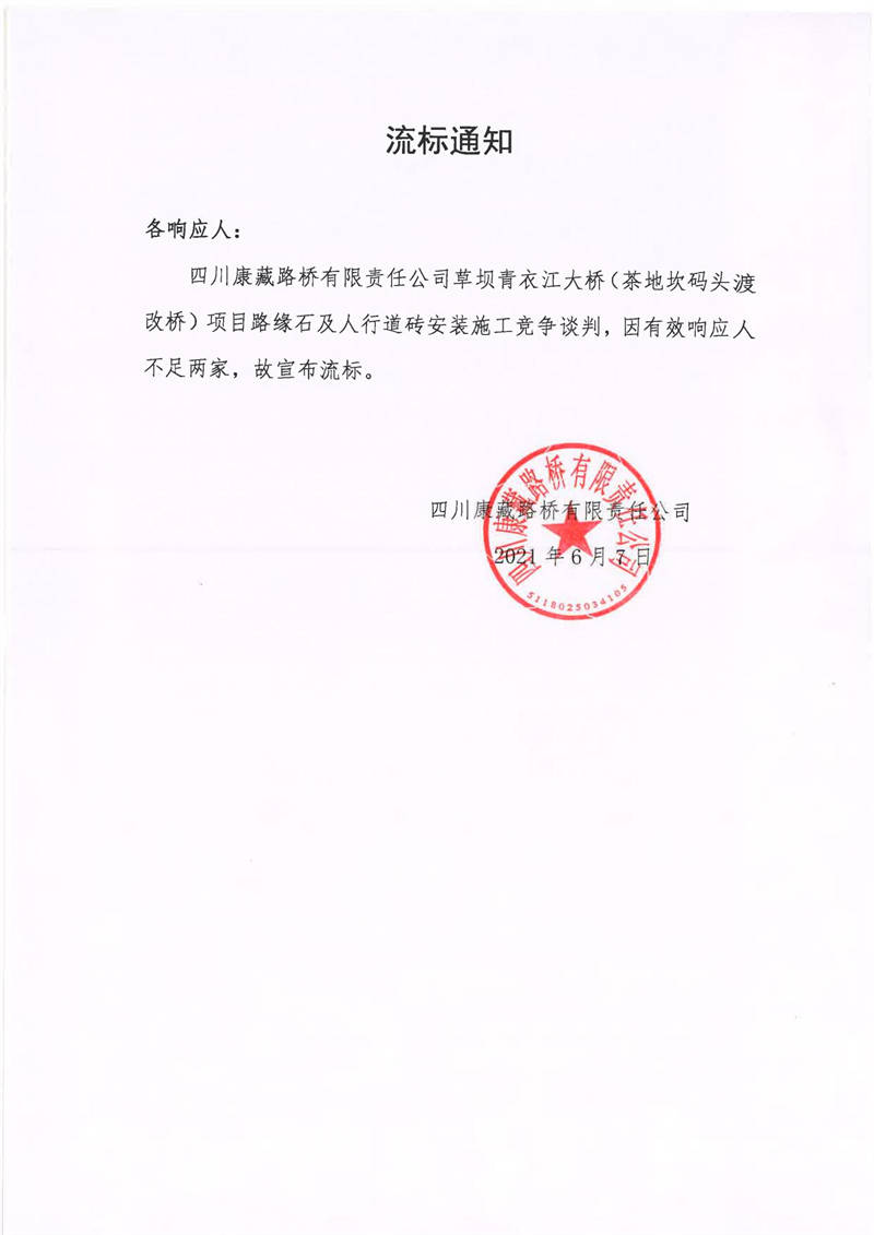 四川康藏路橋有限責任公司草壩青衣江大橋(茶地坎碼頭渡改橋)項目路緣石及人行道磚安裝施工競爭談判流標通知