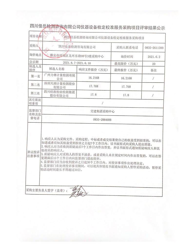 四川佳岳檢測(cè)咨詢有限公司儀器設(shè)備檢定校準(zhǔn)服務(wù)采購(gòu)項(xiàng)目評(píng)審結(jié)果公示