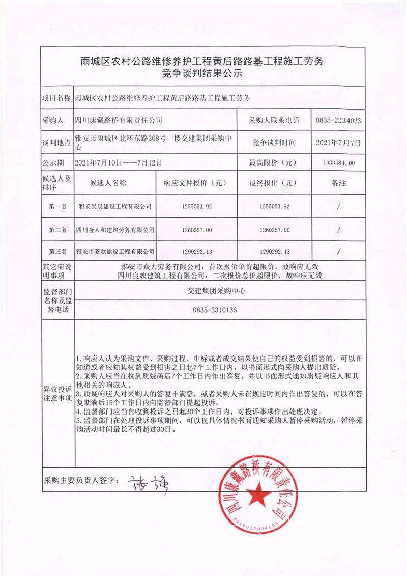 四川康藏路橋有限責(zé)任公司雨城區(qū)農(nóng)村公路維修養(yǎng)護工程黃后路路基工程施工勞務(wù)競爭談判結(jié)果公示