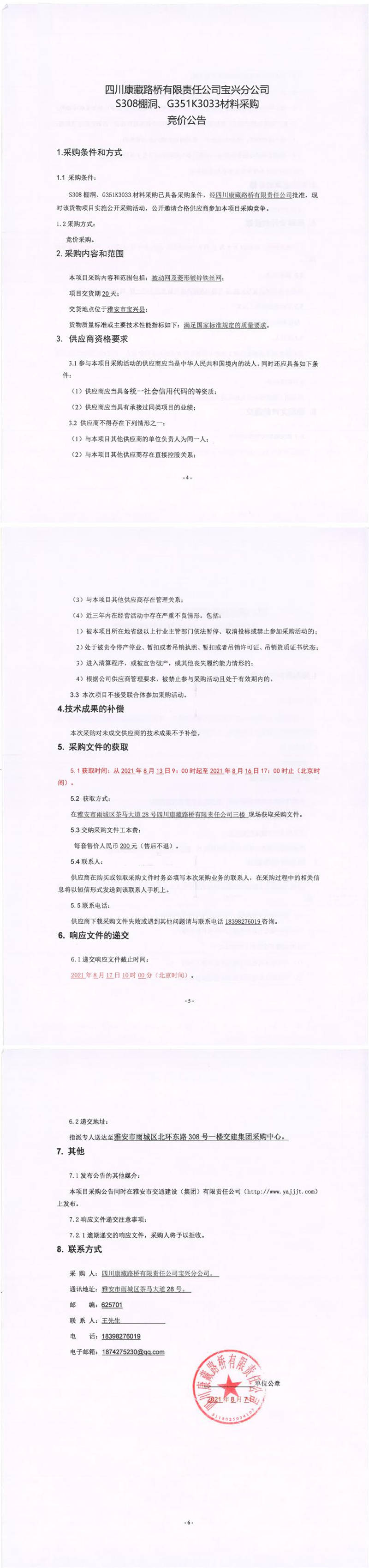 四川康藏路橋有限責(zé)任公司寶興分公司S308棚洞、G351K3033材料采購競(jìng)價(jià)公告