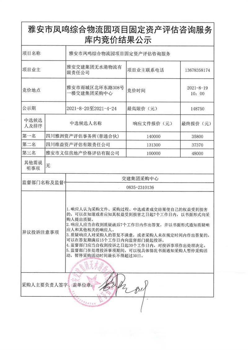 雅安交建集團(tuán)無(wú)水港物流有限責(zé)任公司雅安市鳳鳴綜合物流園項(xiàng)目固定資產(chǎn)評(píng)估咨詢(xún)服務(wù)庫(kù)內(nèi)競(jìng)價(jià)結(jié)果公示