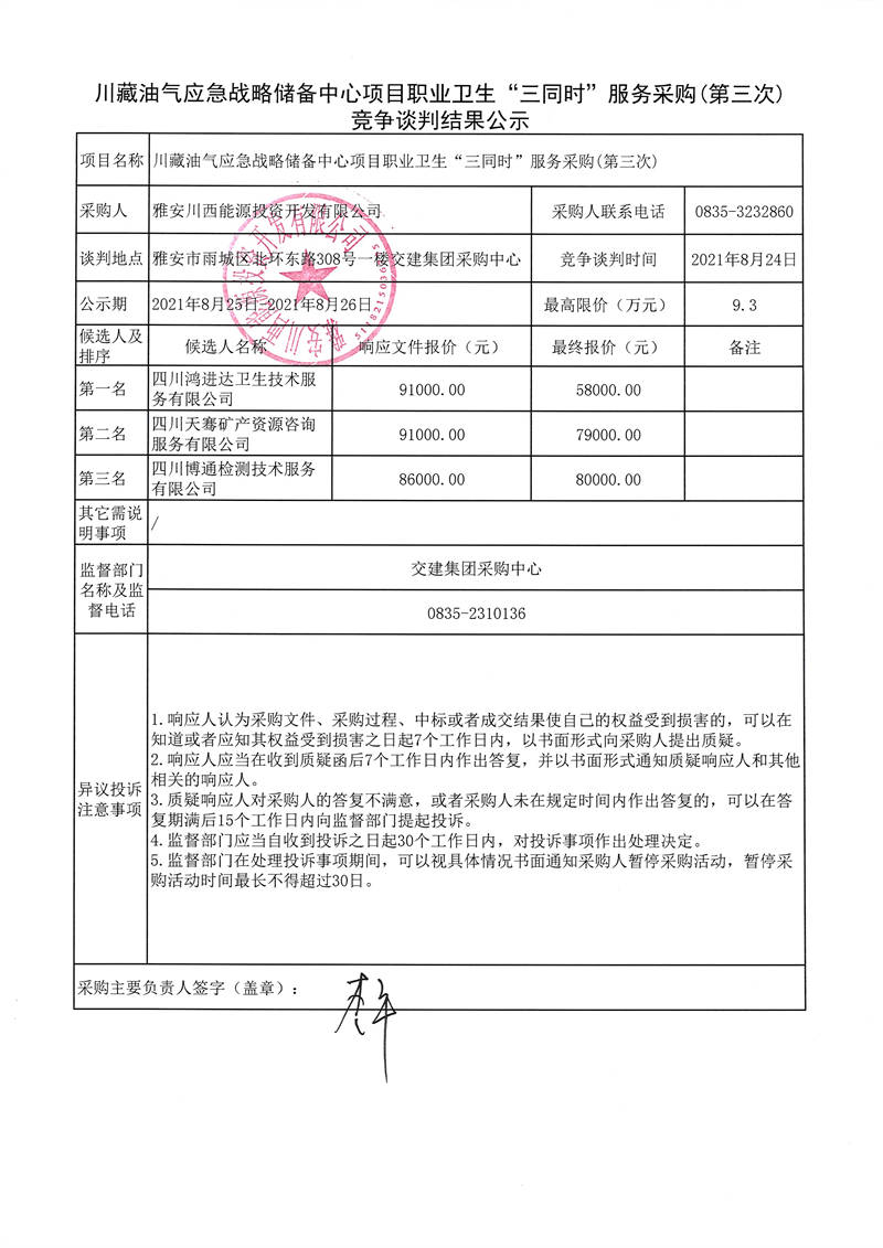 雅安川西能源投資開發(fā)有限公司川藏油氣應急戰(zhàn)略儲備中心項目職業(yè)衛(wèi)生“三同時”服務采購(第三次)競爭談判結(jié)果公示