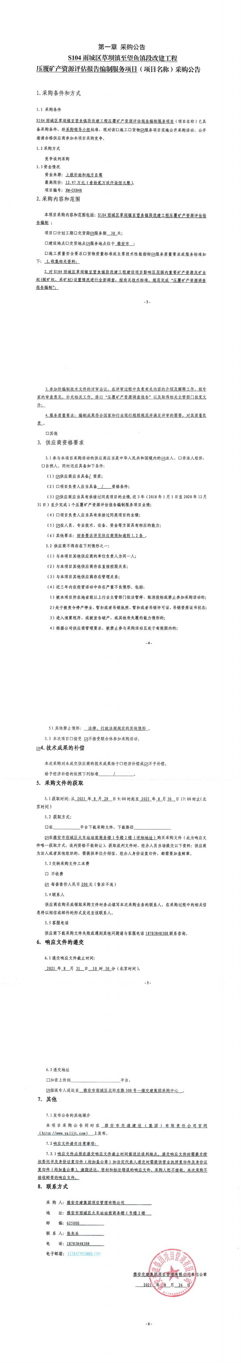 雅安交建集團項目管理有限公司S104雨城區(qū)草壩鎮(zhèn)至望魚鎮(zhèn)段改建工程壓覆礦產(chǎn)資源評估報告編制服務項目采購公告