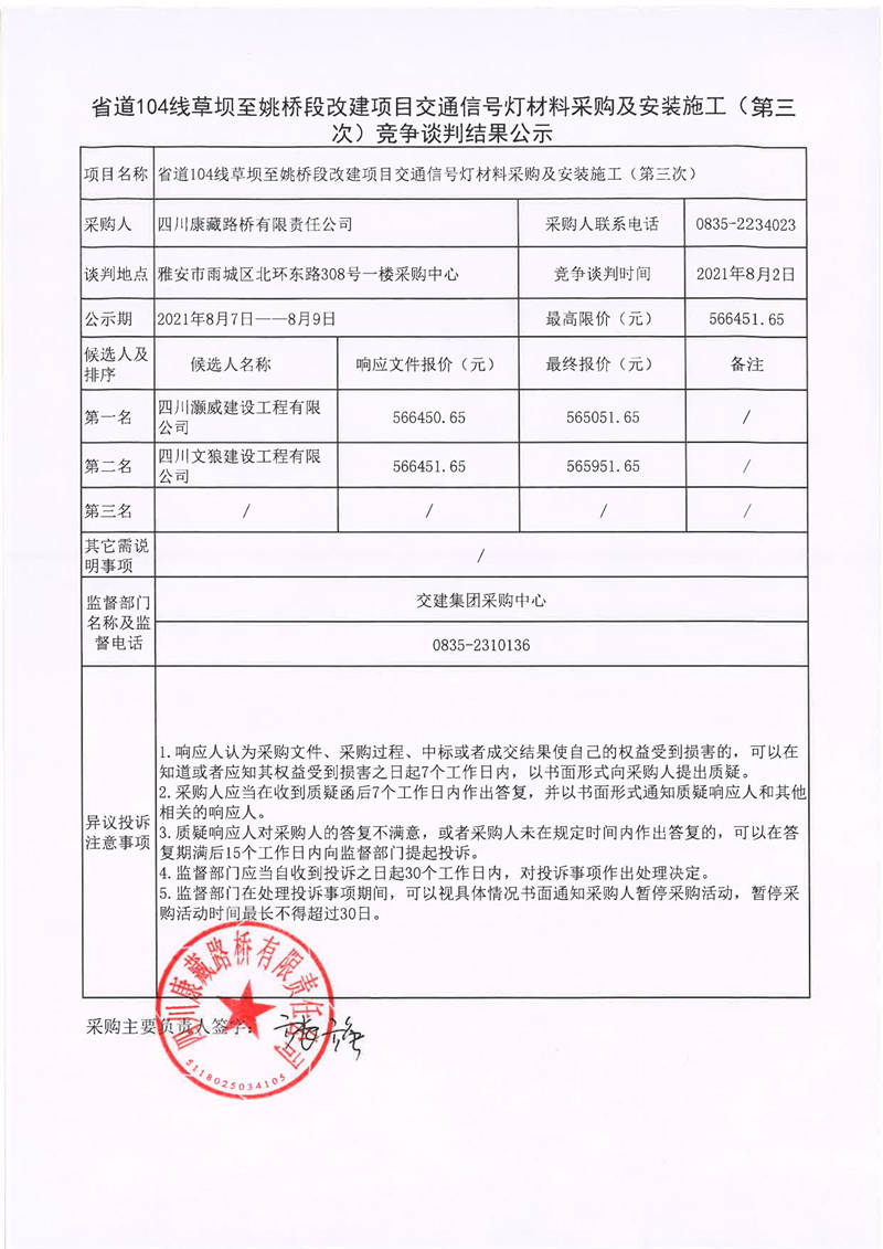 四川康藏路橋有限責任公司省道104線草壩至姚橋改建項目交通信號燈材料采購及安裝施工(第三次)競爭談判結(jié)果公示
