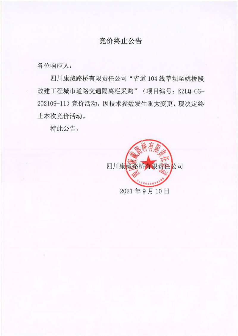 四川康藏路橋有限責(zé)任公司省道104線草壩至姚橋段改建工程城市道路交通隔離欄采購(gòu)競(jìng)價(jià)終止公告