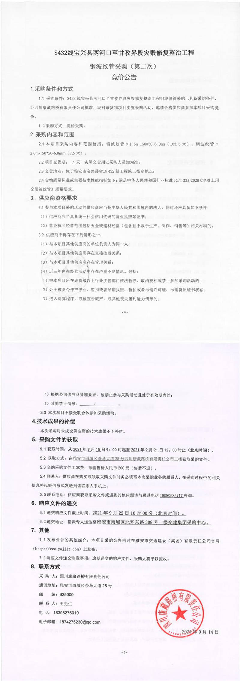 四川康藏路橋有限責任公司S432線寶興縣兩河口至甘孜界段災毀修復整治工程鋼波紋管采購(第二次)競價公告