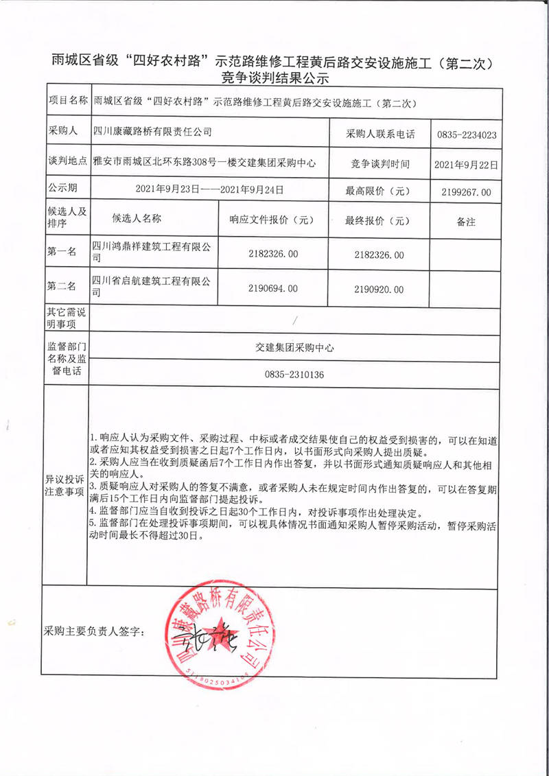 四川康藏路橋有限責(zé)任公司雨城區(qū)省級(jí)“四好農(nóng)村路”示范路維修工程黃后路交安設(shè)施施工(第二次)競(jìng)爭(zhēng)談判結(jié)果公示
