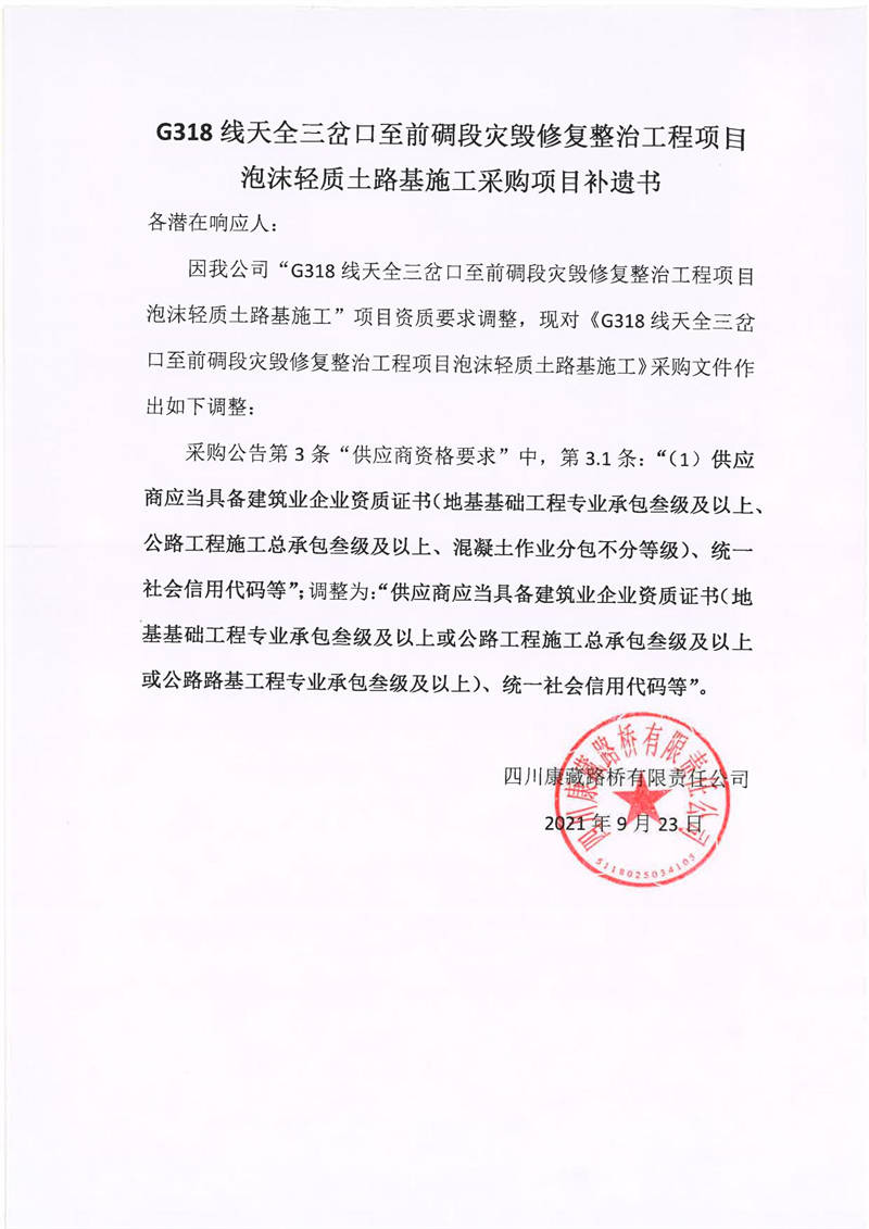四川康藏路橋有限責(zé)任公司G318線天全三岔口至前碉段災(zāi)毀修復(fù)整治工程項(xiàng)目泡沫輕質(zhì)土路基施工采購項(xiàng)目補(bǔ)遺書