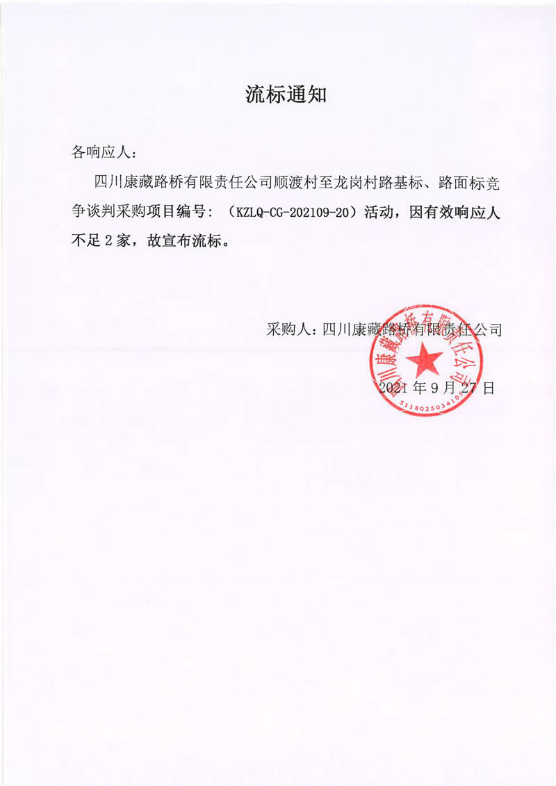 四川康藏路橋有限責(zé)任公司順渡村至龍崗村路基標(biāo)、路面標(biāo)競(jìng)爭(zhēng)談判采購(gòu)項(xiàng)目流標(biāo)通知