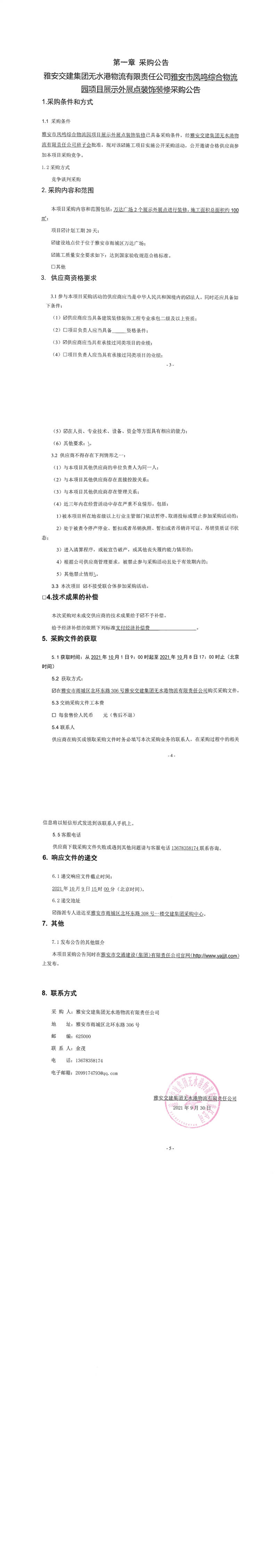 雅安交建集團無水港物流有限責任公司雅安市鳳鳴綜合物流園項目展示外展點裝飾裝修采購公告
