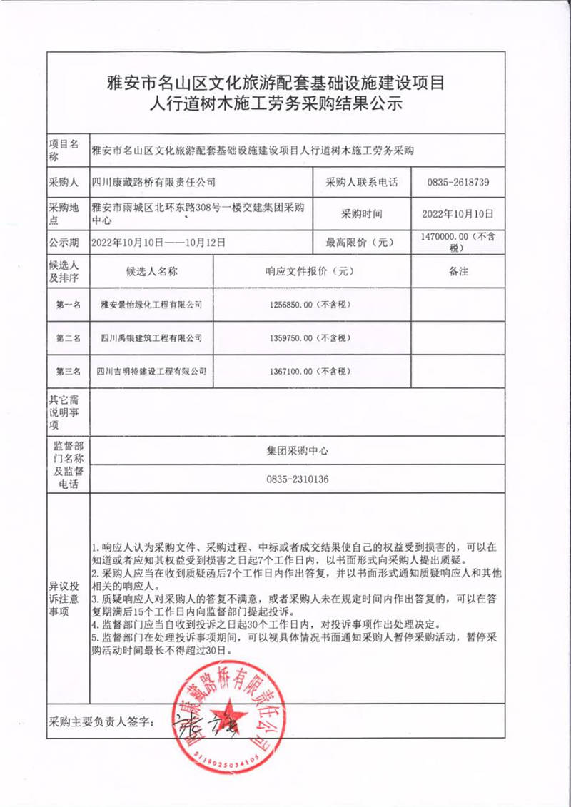 四川康藏路橋有限責任公司雅安市名山區(qū)文化旅游配套基礎(chǔ)設(shè)施建設(shè)項目人行道樹木施工勞務(wù)采購結(jié)果公示
