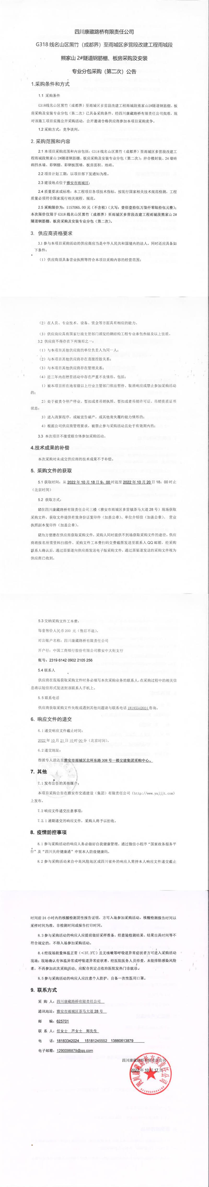 四川康藏路橋有限責任公司G318線名山區(qū)黑竹(成都界)至雨城區(qū)多營段改建工程雨城段熊家山2#隧道鋼筋棚、板房采購及安裝專業(yè)分包采購(第二次)公告
