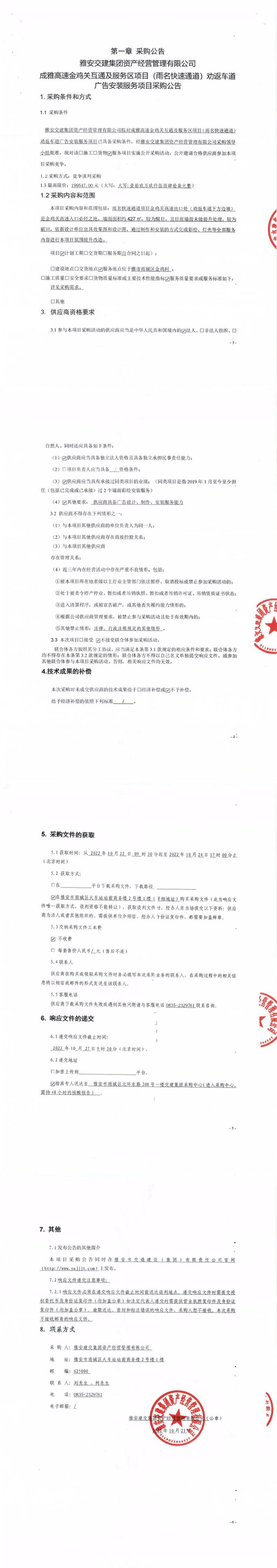 雅安交建集團資產(chǎn)經(jīng)營管理有限公司成雅高速金雞關(guān)互通及服務區(qū)項目(雨名快速通道)勸返車道廣告安裝服務項目采購公告
