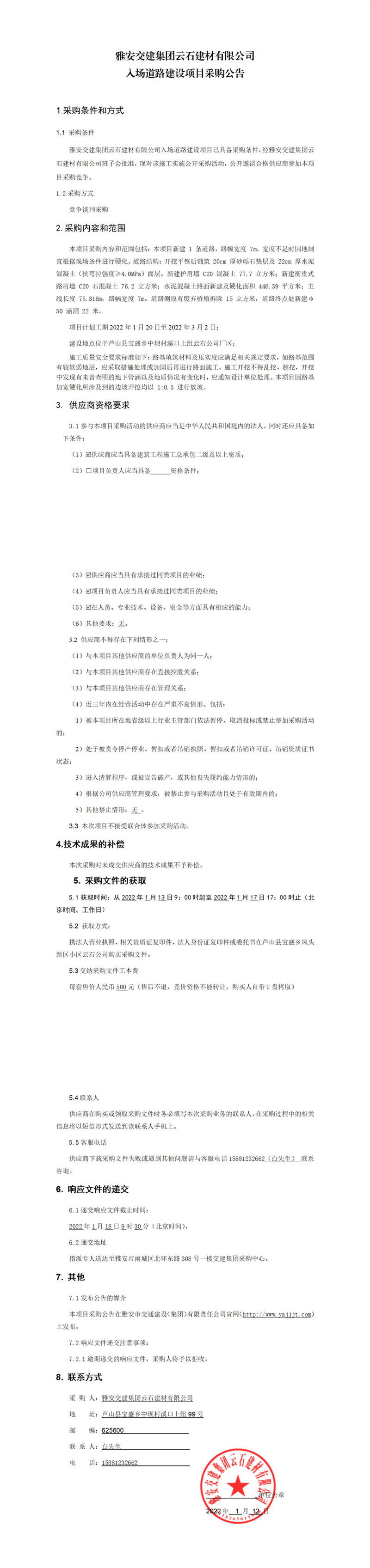 雅安交建集團(tuán)云石建材有限公司入場(chǎng)道路建設(shè)項(xiàng)目采購(gòu)公告