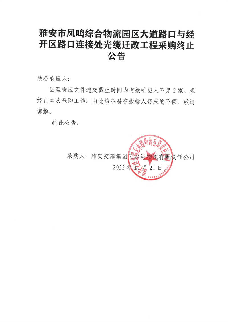 雅安交建集團(tuán)無水港物流有限責(zé)任公司雅安市鳳鳴綜合物流園區(qū)大道路口與經(jīng)開區(qū)路口連接處光纜遷改工程采購(gòu)終止公告