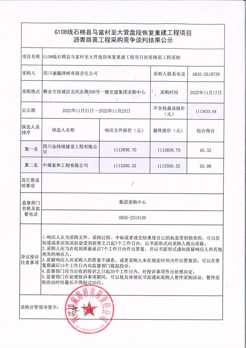 四川康藏路橋有限責(zé)任公司G108線石棉縣馬富村至大營盤段恢復(fù)重建工程項(xiàng)目瀝青路面工程采購競(jìng)爭(zhēng)談判結(jié)果公示