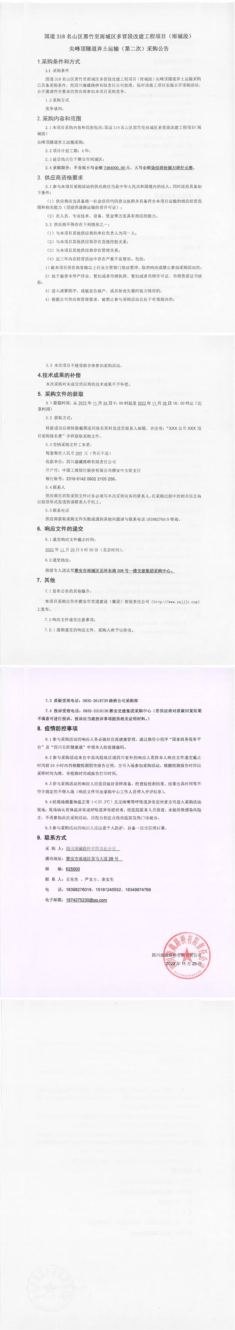 四川康藏路橋有限責任公司國道318名山區(qū)黑竹至雨城區(qū)多營段改建工程項目(雨城段)尖峰頂隧道棄土運輸(第二次)采購公告