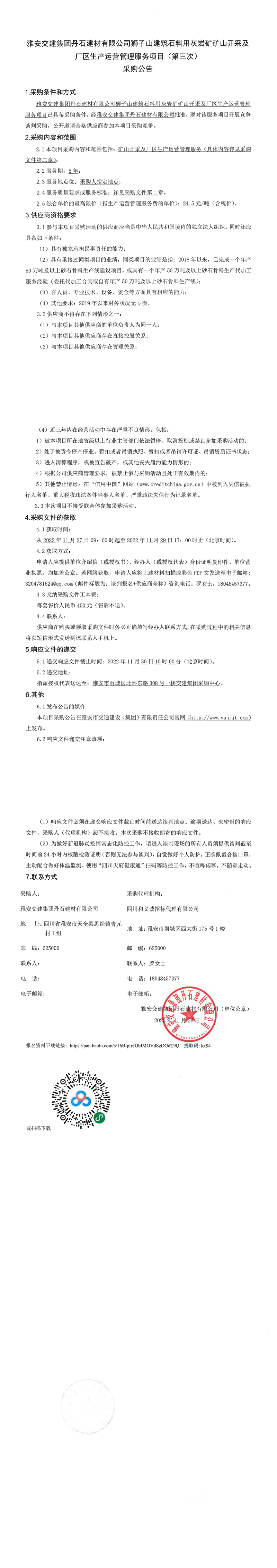 雅安交建集團(tuán)丹石建材有限公司獅子山建筑石料用灰?guī)r礦礦山開采及廠區(qū)生產(chǎn)運(yùn)營(yíng)管理服務(wù)項(xiàng)目(第三次)采購公告
