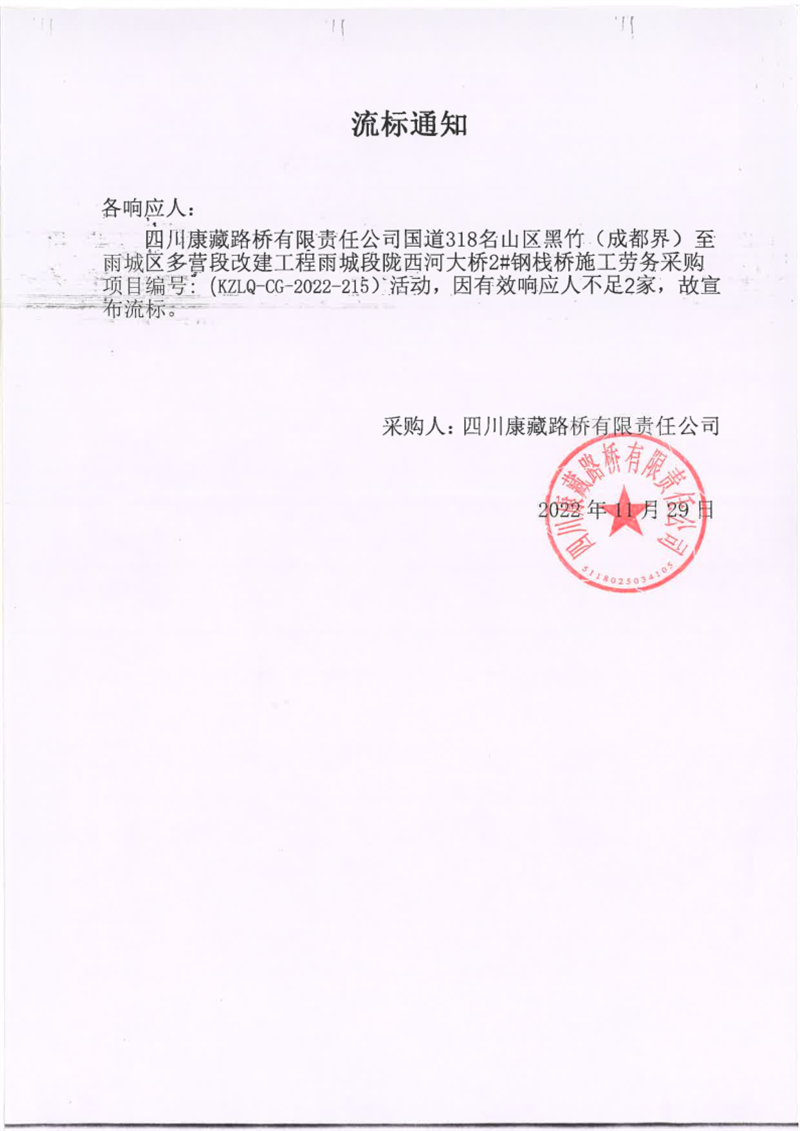 四川康藏路橋有限責(zé)任公司國道318名山區(qū)黑竹(成都界)至雨城區(qū)多營(yíng)段改建工程雨城段隴西河大橋2#鋼棧橋施工勞務(wù)采購流標(biāo)通知