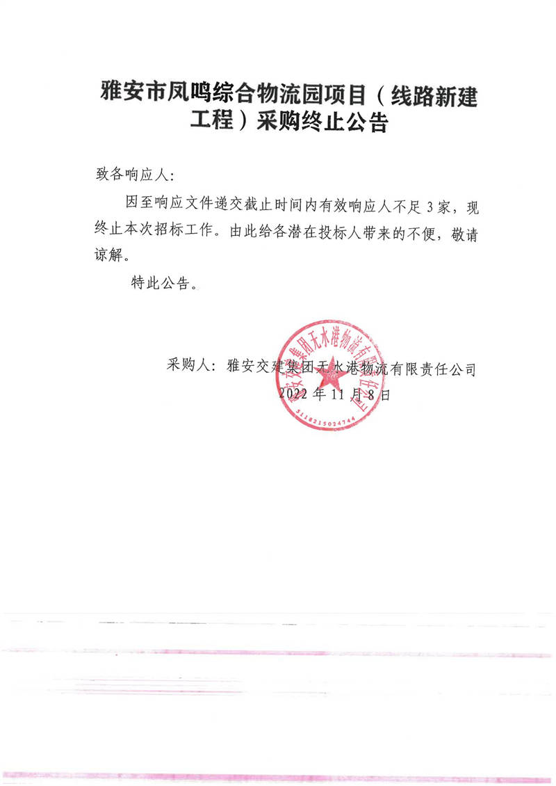 雅安交建集團(tuán)無(wú)水港物流有限責(zé)任公司雅安市鳳鳴綜合物流園項(xiàng)目(線路新建工程)采購(gòu)終止公告