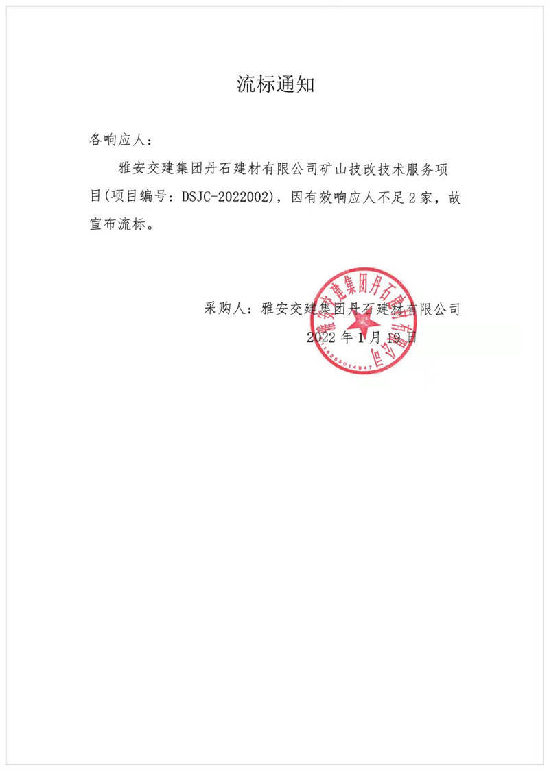 雅安交建集團丹石建材有限公司礦山技改技術(shù)服務(wù)項目流標通知