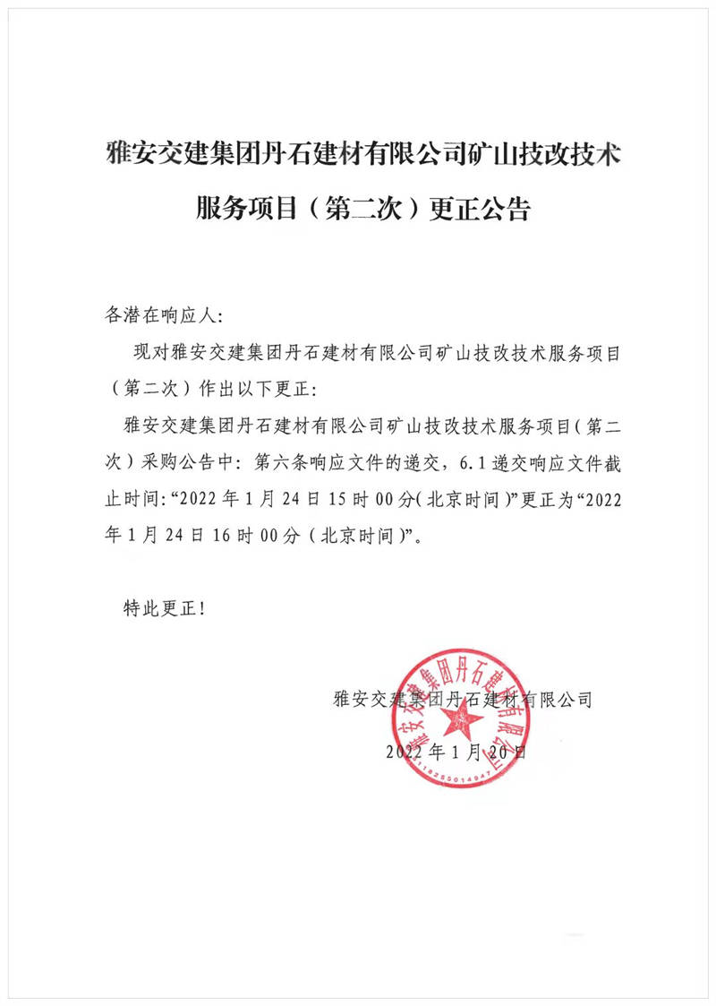 雅安交建集團丹石建材有限公司礦山技改技術(shù)服務(wù)項目(第二次)更正公告