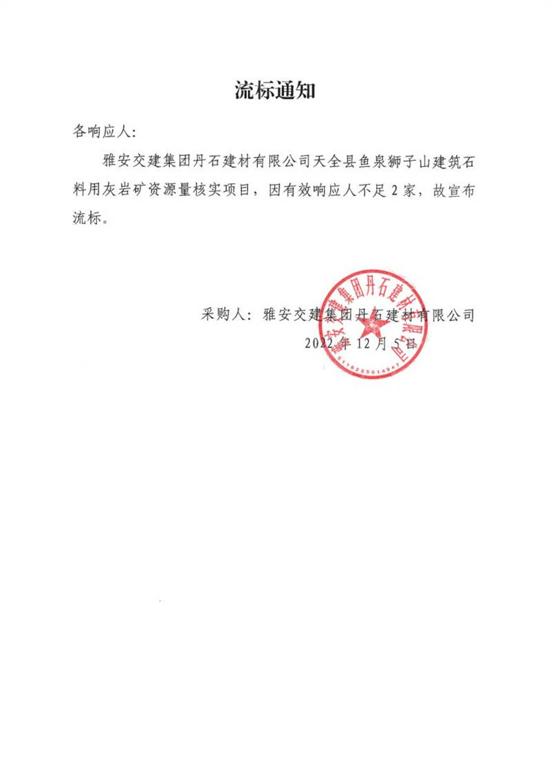 雅安交建集團丹石建材有限公司天全縣魚泉獅子山建筑石料用灰?guī)r礦資源量核實項目流標(biāo)通知