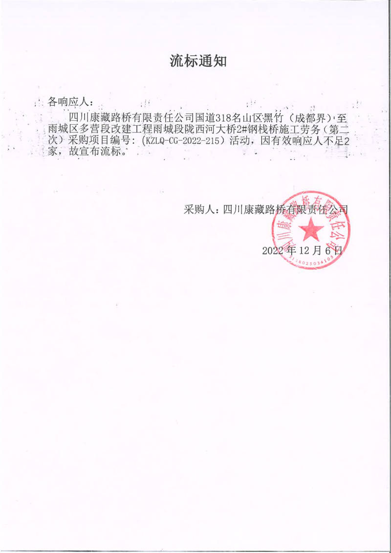 四川康藏路橋有限責(zé)任公司國(guó)道318名山區(qū)黑竹(成都界)至雨城區(qū)多營(yíng)段改建工程雨城段隴西河大橋2#鋼棧橋施工勞務(wù)(第二次)采購(gòu)項(xiàng)目流標(biāo)通知