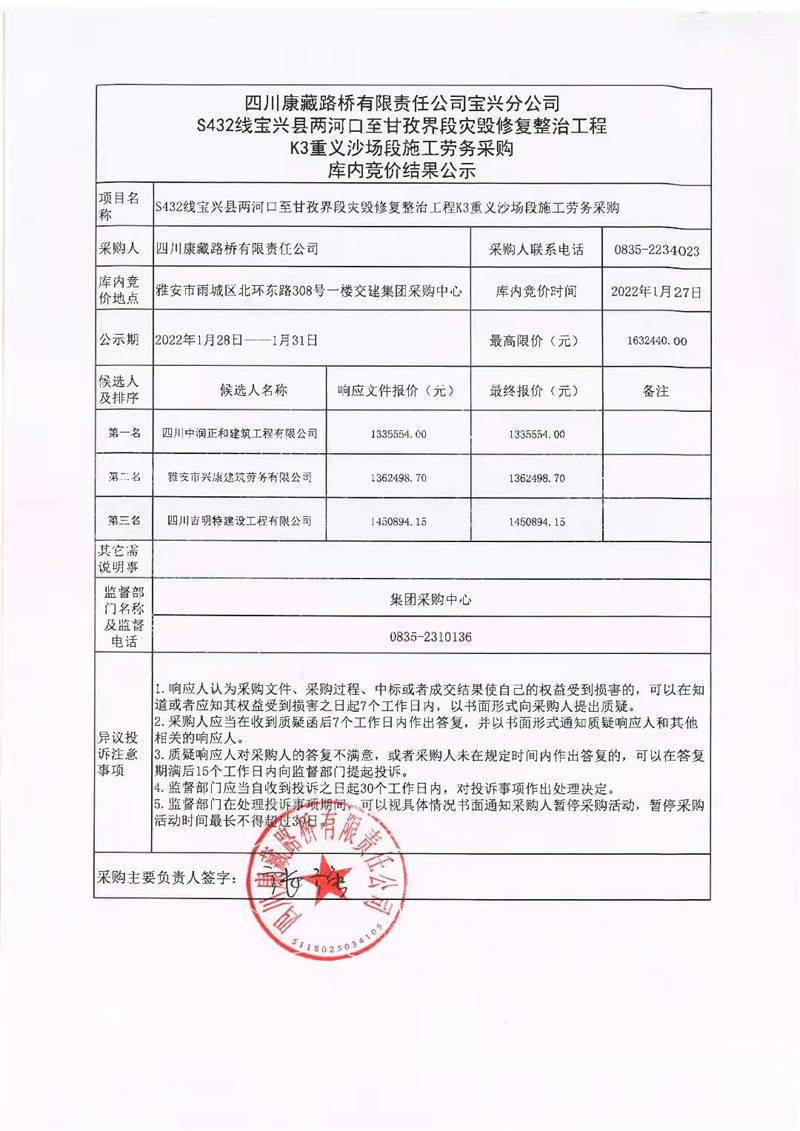 四川康藏路橋有限責任公司寶興分公司S432線寶興縣兩河口至甘孜界段災(zāi)毀修復(fù)整治工程K3重義沙場段施工勞務(wù)采購庫內(nèi)競價結(jié)果公示