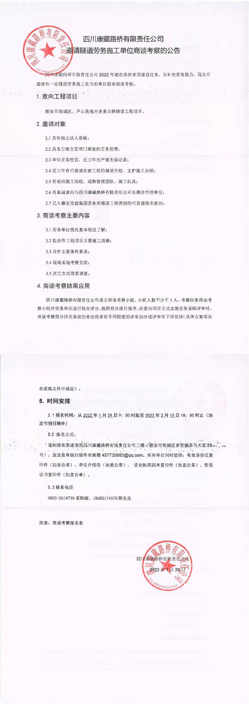 四川康藏路橋有限責任公司邀請隧道勞務施工單位商談考察的公告