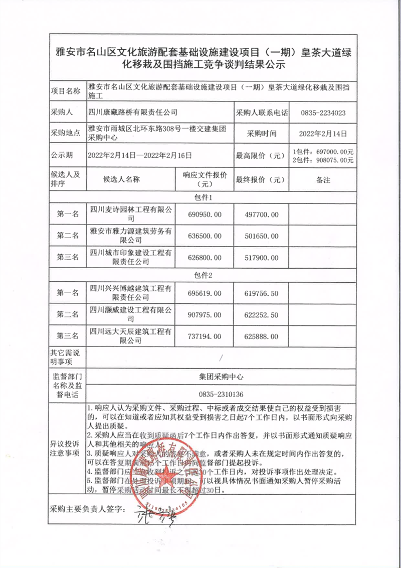 四川康藏路橋有限責(zé)任公司雅安市名山區(qū)文化旅游配套基礎(chǔ)設(shè)施建設(shè)項(xiàng)目(一期)皇茶大道綠化移栽及圍擋施工競(jìng)爭(zhēng)談判結(jié)果公示