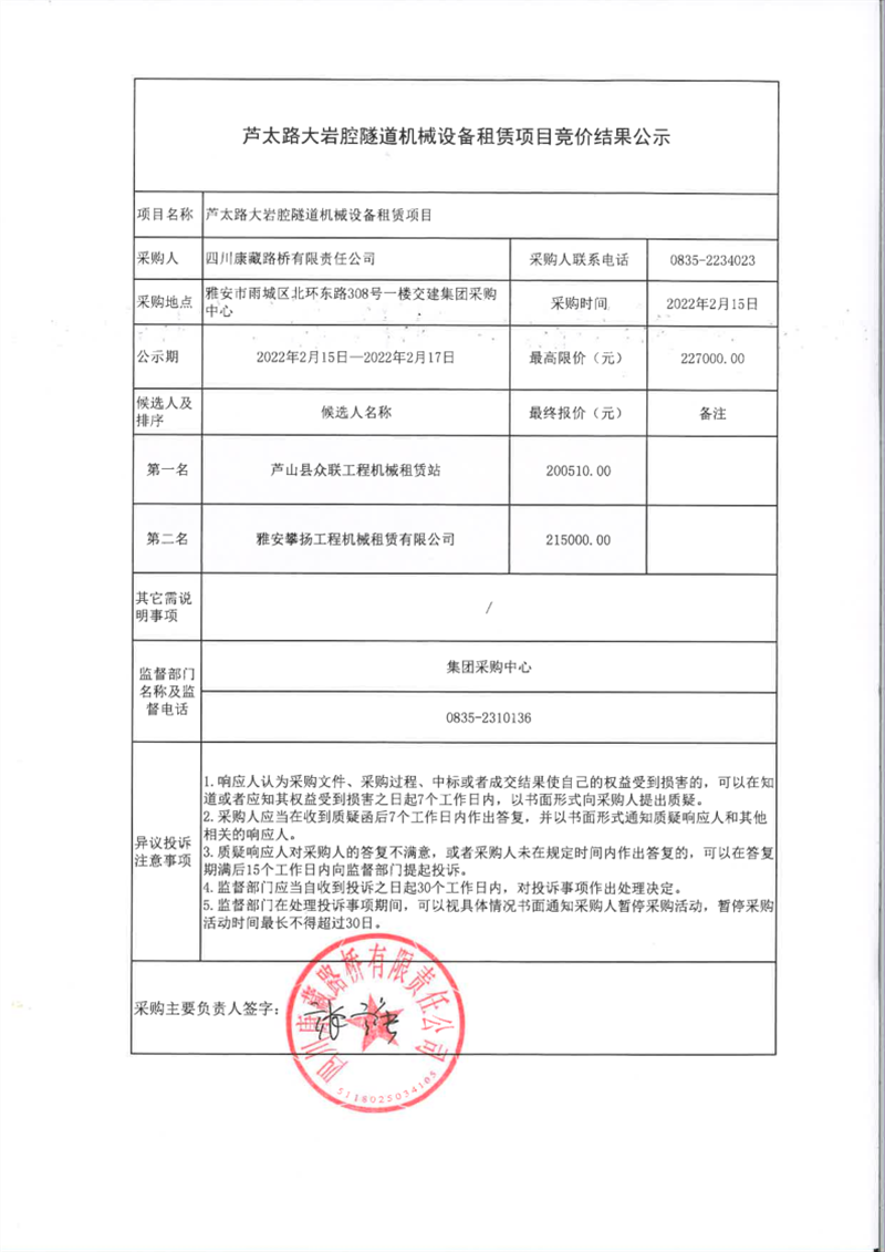 四川康藏路橋有限責任公司蘆太路大巖腔隧道機械設備租賃項目競價結果公示