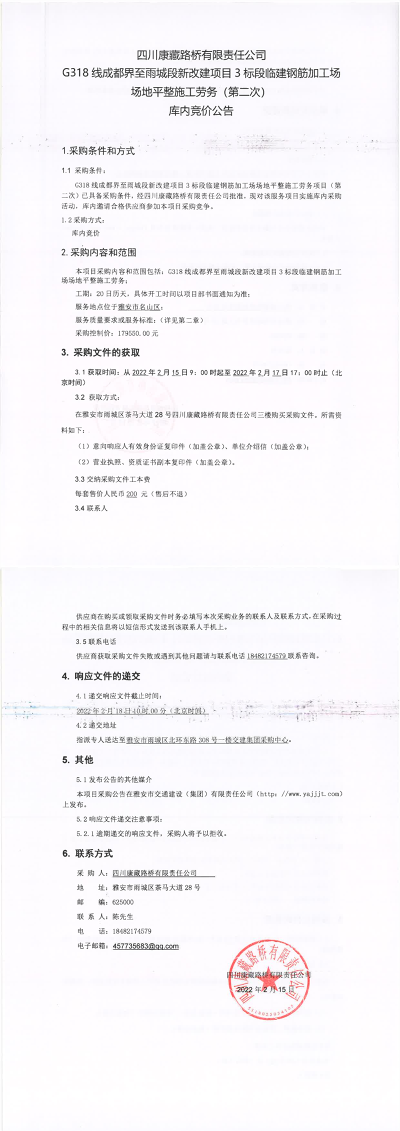 四川康藏路橋有限責(zé)任公司G318線成都界至雨城段新改建項(xiàng)目3標(biāo)段臨建鋼筋加工場(chǎng)場(chǎng)地平整施工勞務(wù)(第二次)庫(kù)內(nèi)競(jìng)價(jià)公告