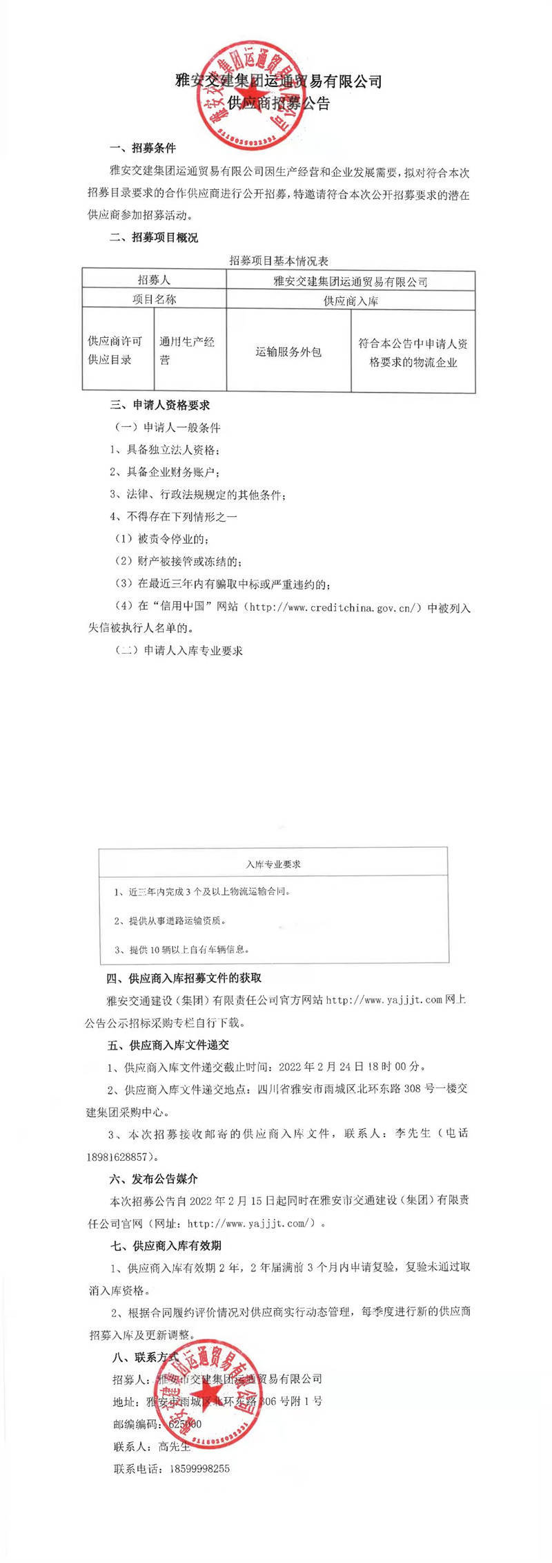 雅安交建集團(tuán)運(yùn)通貿(mào)易有限公司供應(yīng)商招募公告