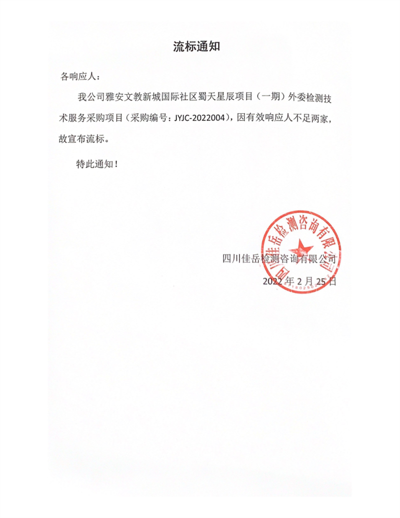 四川佳岳檢測咨詢有限公司雅安文教新城國際社區(qū)蜀天星辰項目(一期)外委檢測服務(wù)采購項目流標(biāo)通知