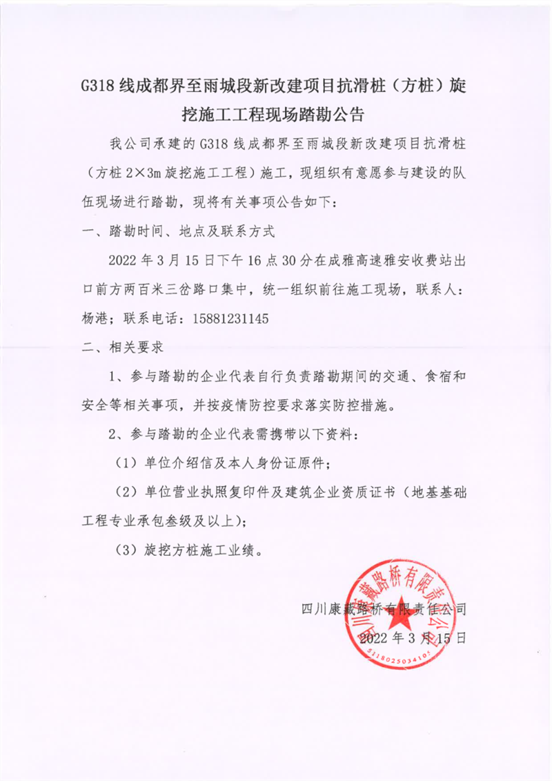 四川康藏路橋有限責(zé)任公司G318線成都界至雨城段新改建項(xiàng)目抗滑樁(方樁)旋挖施工工程現(xiàn)場(chǎng)踏勘公告