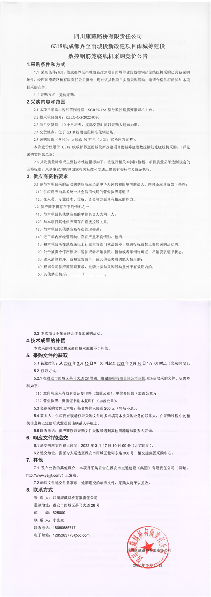 四川康藏路橋有限責(zé)任公司G318線成都界至雨城段新改建項(xiàng)目雨城籌建段數(shù)控鋼筋籠繞線機(jī)采購競(jìng)價(jià)公告