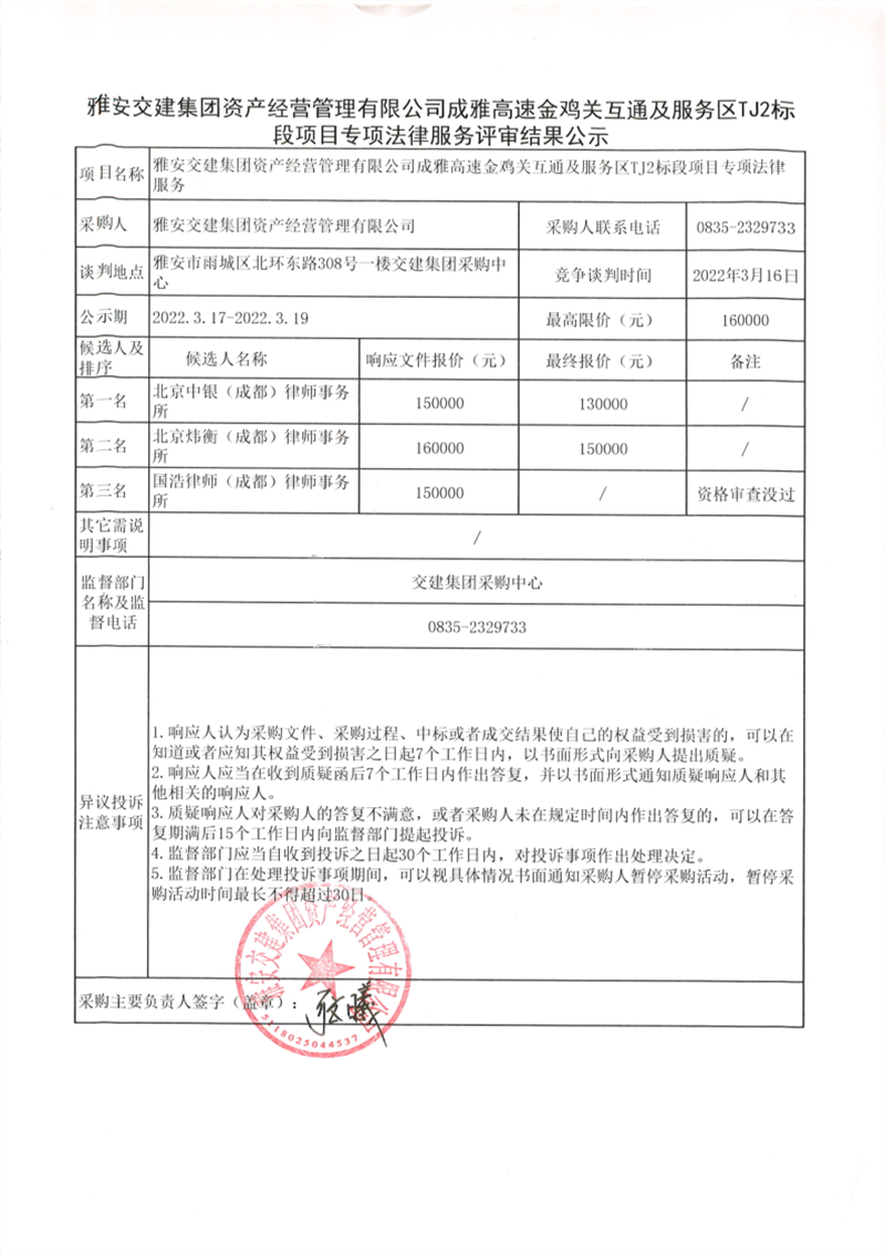 雅安交建集團(tuán)資產(chǎn)經(jīng)營管理有限公司成雅高速金雞關(guān)互通及服務(wù)區(qū)TJ2標(biāo)段項(xiàng)目專項(xiàng)法律服務(wù)評審結(jié)果公示