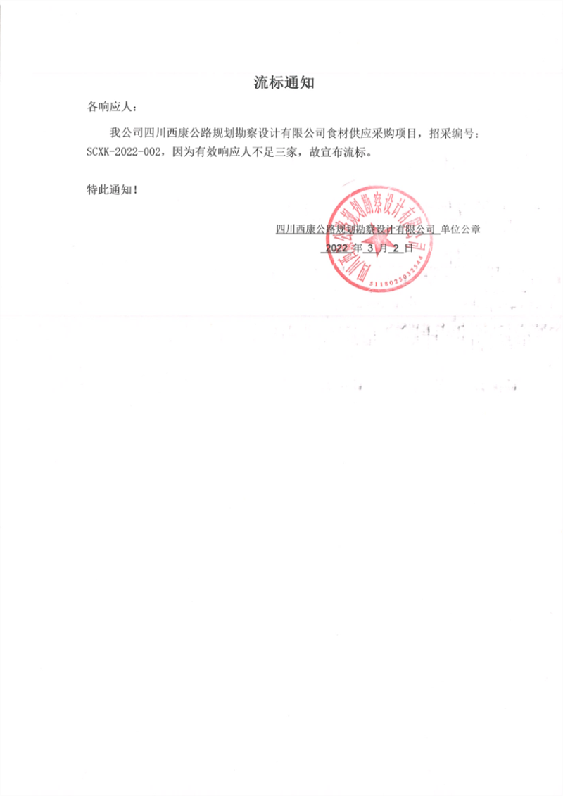四川西康公路規(guī)劃勘察設(shè)計有限公司食材供應(yīng)采購項目流標通知