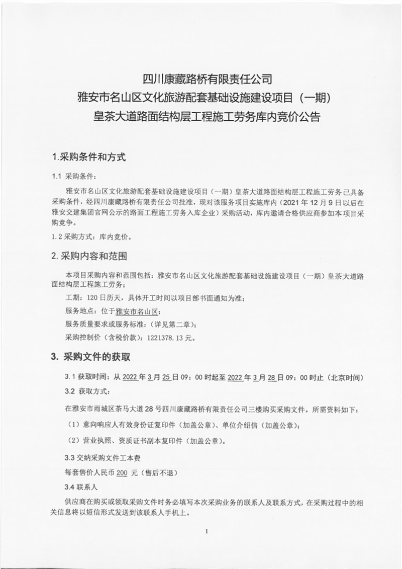 四川康藏路橋有限責(zé)任公司雅安市名山區(qū)文化旅游配套基礎(chǔ)設(shè)施建設(shè)項(xiàng)目(一期)皇茶大道路面結(jié)構(gòu)層工程施工勞務(wù)庫內(nèi)競價(jià)公告