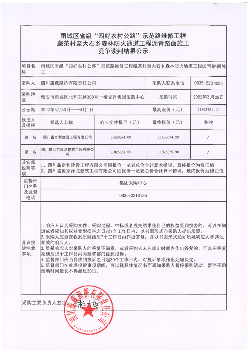 四川康藏路橋有限責任公司雨城區(qū)省級“四好農(nóng)村公路”示范路維修工程藏茶村至大石鄉(xiāng)森林防火通道工程瀝青路面施工競爭談判結果公示