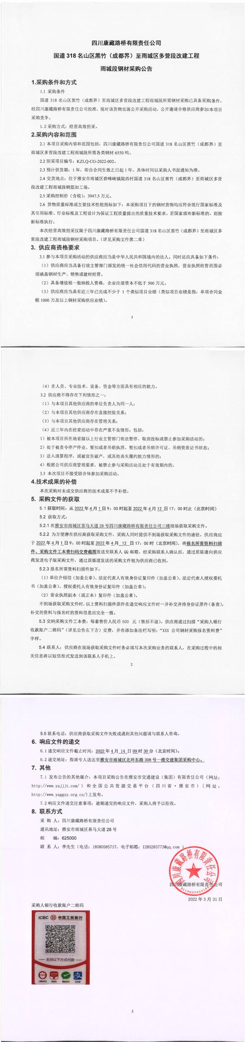 四川康藏路橋有限責(zé)任公司國道318名山區(qū)黑竹(成都界)至雨城區(qū)多營段改建工程雨城段鋼材采購公告